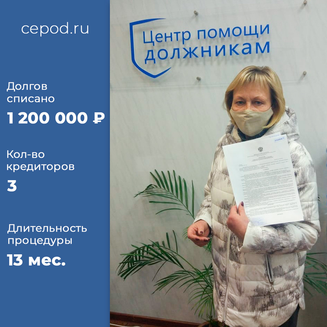 Мы помогли ей пройти процедуру банкротства и списать долги у 3 кредиторов, на общую сумму 1 200 000. В связи с пандемией дело затянулось и длилось 13 месяцев.